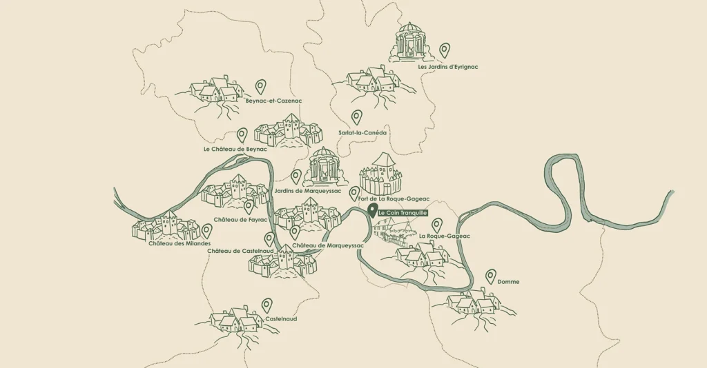 La Roque-Gageac se trouve dans le « triangle d’or » et la vallée des cinq châteaux… Beynac, les jardins de Marqueyssac, Fayrac, Castelnaud et le château des Milandes. Châteaux, forts, une belle rivière, jardins à la française, vues magnifiques, gastronomie, marchés… la région a tout pour plaire.